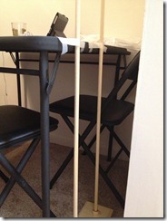 While mine were drying, I did this. Basically tape them to the edge of a table so they stay standing straight while the glue dries. Otherwise, you’ll be holding dowels upright for what is typically known as “a long ass time.” I left mine standing like this for two days.